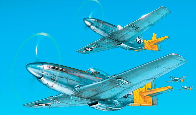 En la quinta página, disfrutamos de la vista de la aproximación de los Mustang P-51D del escuadrón de caza 462 (se activó el 21 de octubre de 1944 y se desmanteló el 1 de abril de 1959), perteneciente al grupo de caza 506 (se activó el 5 de octubre de 1944 y se desmanteló el 16 de diciembre de 1945 para reactivarse posteriormente durante la Guerra Fría).