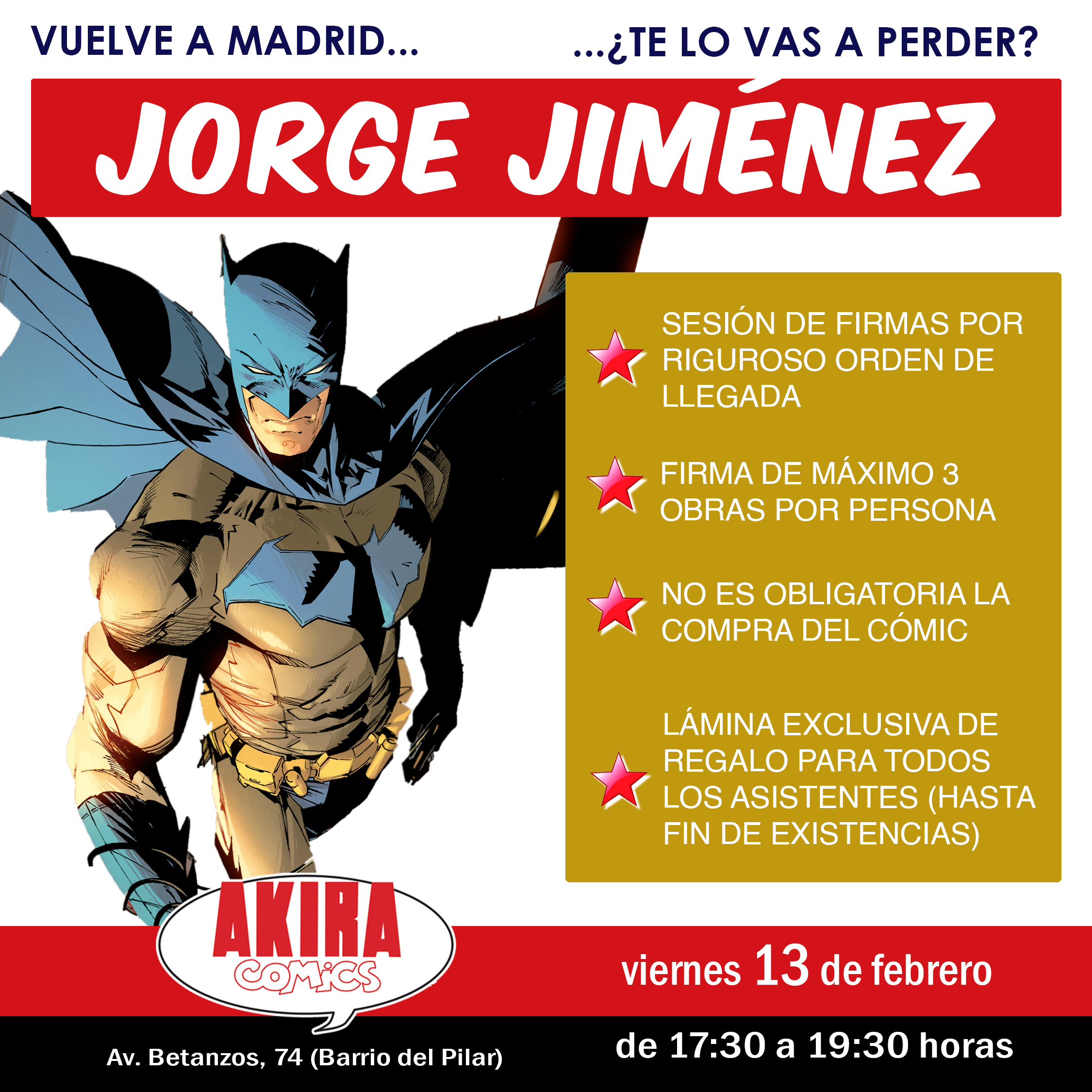 Todos los asistentes recibirán de regalo una lámina exclusiva y limitada del Batman de Jorge Jiménez (hasta fin de existencias).