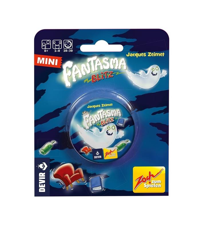 El gran clásico familiar que pone a prueba tus reflejos y tu agudeza visual vuelve… ¡Más pequeño que nunca! Fantasma Blitz Mini es una versión reducida del juego clásico, pero que mantiene intacta toda su esencia. Esta nueva edición en formato lata está pensada para llevarla a cualquier parte, y todo ello a un precio más económico. Pensado para todos los bolsillos… ¡Literalmente! Diseñado por Jacques Zeimet e ilustrado por Gabriela Silveira, Fantasma Blitz Mini está pensado para jugar en pareja y en grupos de hasta 8 personas, a partir de 8 años, en partidas de no más de 20 minutos de duración. Dentro de la lata hay 60 cartas y 5 objetos y el objetivo de los jugadores consiste en quedarse con el mayor número posible de cartas. Para preparar la partida, tienes que colocar en el centro de la mesa, y al alcance de la mano de todos los jugadores, los cinco objetos que trae el juego. Se trata de cinco piezas que tienen la forma de un sofá de color rojo, un libro azul, un ratón gris, una botella verde y, finalmente, el fantasma de color blanco. Al lado de los objetos se pone la pila de cartas y, cuando estemos listo, el primer jugador da la vuelta a la primera carta y comienza el juego. ¡Todos los jugadores intentarán descubrir cuál es el objeto que se repite de forma idéntica y atraparlo! En Fantasma Blitz, cuando aciertes, colocarás la carta sobre la mesa enfrente de ti. Esta será tu recompensa, pero si pierdes tendrás que devolver una de ellas a la pila de cartas. Una vez que termine la pila de cartas, el juego habrá terminado y se contarán las cartas que tiene cada jugador. ¡El que más cartas tenga, gana! Fantasma Blitz es un juego perfecto para los más pequeños de casa. Se trata de un diseño ideal para introducir a los más peques de casa en el universo de los juegos de mesa modernos. Y con este nuevo formato portátil y económico, ahora también es un compañero de viaje imprescindible. ¡Pon a prueba tus reflejos y sé más rápido que el rayo para quedarte con todas las cartas que puedas!