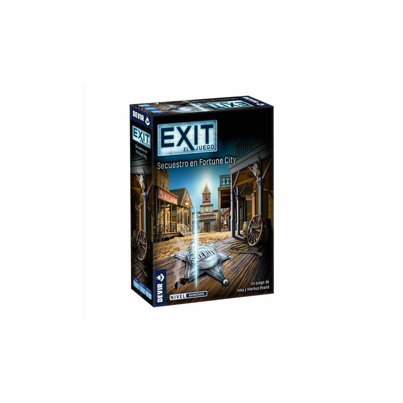 Han raptado al sheriff de Fortune City. ¡Encontrad al secuestrador y salvad al sheriff! Para conseguirlo tendréis que visitar la taberna, la tienda, la armería, la oficina de correos, la cárcel y el banco. ¡A vosotros os tocará elegir por dónde empezáis! Exit: Secuestro en Fortune City es un juego de escape cooperativo diseñado por Inka y Markus Brand, que se puede disfrutar en solitario o en un grupo de hasta 4 personas, a partir de 12 años, en partidas que pueden durar entre 45 y 90 minutos. A través de un gran mazo de 85 cartas, un disco descodificador y algunos artefactos especiales, los jugadores podrán explorar e interactuar con el entorno y todo lo que vayan encontrando en su viaje. La saga de juegos Exit nos trae en cada caja todo lo necesario para vivir la emoción de las mejores Escape room o salas de escape desde el salón de casa. Cada título tiene una temática y una historia completamente diferente en la que los jugadores son los protagonistas. Una aventura ideal para pasar una divertida tarde en solitario, en familia o entre amigos que pondrá a prueba la capacidad de observación, el ingenio y la creatividad de todos los participantes. El formato compacto y portátil de la caja convierten este juego en un compañero ideal para cualquier viaje. Con una dificultad de nivel avanzado, Exit: Secuestro en Fortune City es un título ideal para aquellos que ya hayan probado algún juego de la saga y quieran subir un peldaño la dificultad superando un buen reto. Prestar atención a los detalles, la buena comunicación entre los miembros del equipo y afilar la capacidad de deducción serán las claves que os permitirán tener éxito en esta aventura.