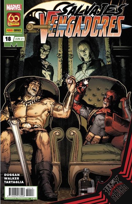 Cruce con Rey de Negro. Conan, Masacre y Volador Nocturno escapan de Rykeren la noche eterna del ataque de Knull contra la Tierra. ¿Qué locura arruinará el trigésimo aniversario del nacimiento de Wade Wilson? Te damos una pista: implica al Club Fuego Infernal.