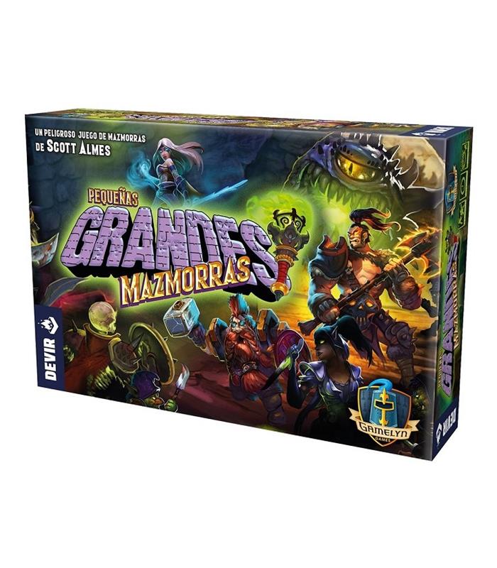 ¡¡Necesitamos vuestra ayuda, héroes! La corrupción se expande y solo los aventureros más osados pueden enfrentarse a ella. Pequeñas grandes mazmorras es un juego cooperativo diseñado por Scott Almes que tanto se puede disfrutar en solitario como hasta con un grupo de 4 jugadores, a partir de 14 años, en partidas de entre 45 y 60 minutos. El objetivo del juego parece fácil: encontrar la guarida del jefe oculta en el interior de la mazmorra y derrotarlo tras un épico combate. Pero la oscuridad está repleta de peligros… Las partidas de Pequeñas grandes mazmorras se desarrollan en 2 actos. En el primero, los héroes explorarán la mazmorra en busca de la guarida del jefe. A lo largo de esta fase, los jugadores irán revelando una serie de cartas (barajadas aleatoriamente) que representan las diferentes salas y que conforman el tablero modular ¡Nunca habrá dos escenarios iguales! Entre pasillos y habitaciones, los héroes se toparán con trampas, enemigos, portales, misteriosas pociones o cofres de botín y objetos legendarios. Sin embargo, el tiempo apremia: los aventureros disponen de un número limitado de turnos para encontrar la guarida del jefe. El marcador de antorcha, que representa la lucha contra la oscuridad, irá avanzando inexorablemente cada turno hasta que se apague. Tampoco pueden permitir que la mazmorra se llene de goblins… ¡Habrá que luchar y correr, no hay tiempo que perder! Gracias a su fuerza, agilidad e intelecto, los héroes se abrirán paso entre pasillos y múltiples peligros. Si finalmente logran encontrar la guarida del jefe y derrotan a todos los esbirros (habrá uno por jugador en cada partida), empezará la segunda fase de la aventura. ¡Empieza el combate más difícil! En este punto, todos los héroes unirán sus fuerzas para tratar de derrotarle. También deberán destruir los altares que le protegen si quieren reducir su vida a cero. Si lo consiguen antes que el marcador de antorcha llegue a la casilla de calavera, habrán completado con éxito la aventura y librado al mundo de la oscuridad. La experiencia de juego cambia mucho de una partida a otra. En total hay 8 héroes distintos, cada uno con características y habilidades propias. ¡Prueba distintos para encontrar el estilo de juego que mejor se adapte a ti! Los enemigos también variarán en cada partida: hay 6 jefes finales y 8 esbirros distintos. Si lo deseas, puedes personalizar las mazmorras antes de cada partida para crear temáticas únicas, adaptadas a los gustos de tu grupo de juego. Pequeñas grandes mazmorras también se puede disfrutar en solitario. En esta modalidad el jugador deberá usar al menos dos aventureros gestionando por separado sus características, botín, hechizos y ubicación en la mazmorra. Sin embargo, ¡también puedes usar tres o cuatro héroes! Si eres un enamorado de la fantasía épica, Pequeñas grandes mazmorras no puede faltar en tu estantería. Con reglas al alcance de todos los públicos y un sinfín de partidas posibles, te garantiza muchas horas de diversión. ¡Coopera con otros héroes y derrota las fuerzas del mal antes que la oscuridad lo consuma todo por completo!