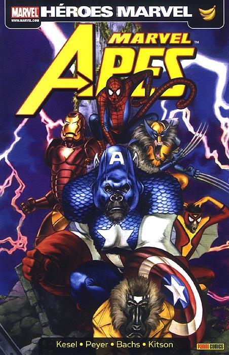 ¡No es un sueño! ¡No es una historia imaginaria! ¡No tiene nada que ver con Charlton Heston! Todos los héroes del Universo Marvel se han convertido en… ¿Monos? Contempla la espectacular ciudad simia de Monkhattan, únete a héroes y villanos homínidos, como Spider-Monkey, Doc Ook, Iron Mandril y muchos más. Siente el escalofrio ante el retorno de Speedball y aprende el oscuro secreto de este mundo de primates. Si Marvel Zombies te aterrorizó, Marvel Apes conseguirá que tu mandíbula se desencaje. Completa edición llena de extras.
